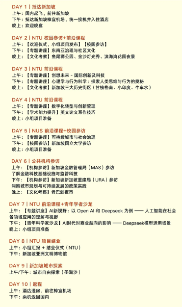 项目开设东南亚治理与社区文化、AI 应用新视野、可持续城市与社会治理等跨学科核心课程,参访新加坡金融管理局(MAS)、重建局(URA)等机构,洞悉 “政经政策规制 + AI 技术赋能” 在金融科技、智慧城市、公共治理等领域的前沿实践逻辑。