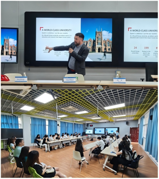 Alex Wilson对学校的热情接待表示感谢,并介绍了女王大学的国际化发展情况。他指出,女王大学学科实力雄厚,教学质量卓越,且与英国企业联系紧密,学生拥有丰富的实习与实践机会。他表示,希望未来能与我校进一步深化合作,拓展联合培养项目的覆盖范围。